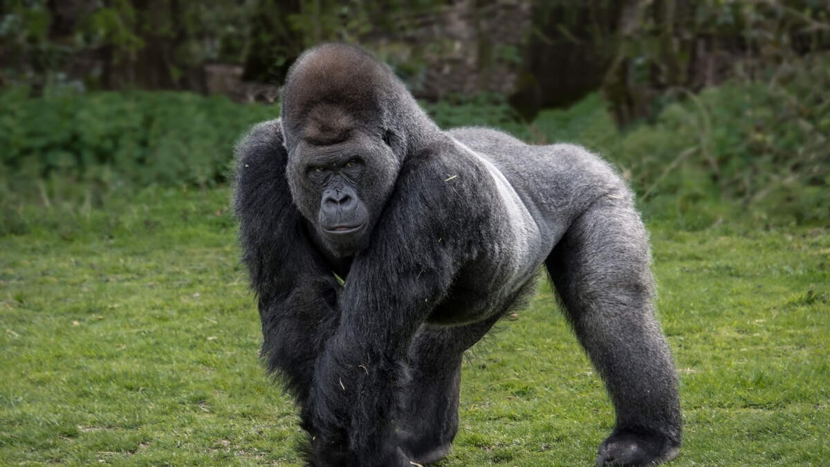 Over the photos and probably his situation in general, this gorilla takes this matter into his own hands. What does he do? Give the bird. Funny, but I wonder if he knows what that meant.